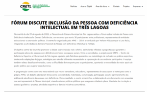 Na manhã do dia 29 de agosto de 2025, o Plenarinho da Câmara Municipal de Três Lagoas sediou o Fórum sobre Inclusão da Pessoa com Deficiência Intelectual e Demais Deficiências, um encontro que reuniu 30 participantes entre profissionais, representantes de entidades educacionais e autoridades políticas. O evento foi organizado pela APAE – CER II e conduzido por Verlaine Albuquerque e Lana Raíza, integrando as atividades da Semana Nacional da Pessoa com Deficiência Intelectual e Múltipla. Ler mais…